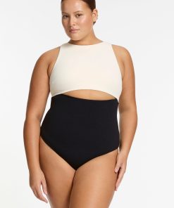 Jets Women’s One Piece Swim Versa Rib Cut Out High Neck One Piece – Black/cream | Black & Cream